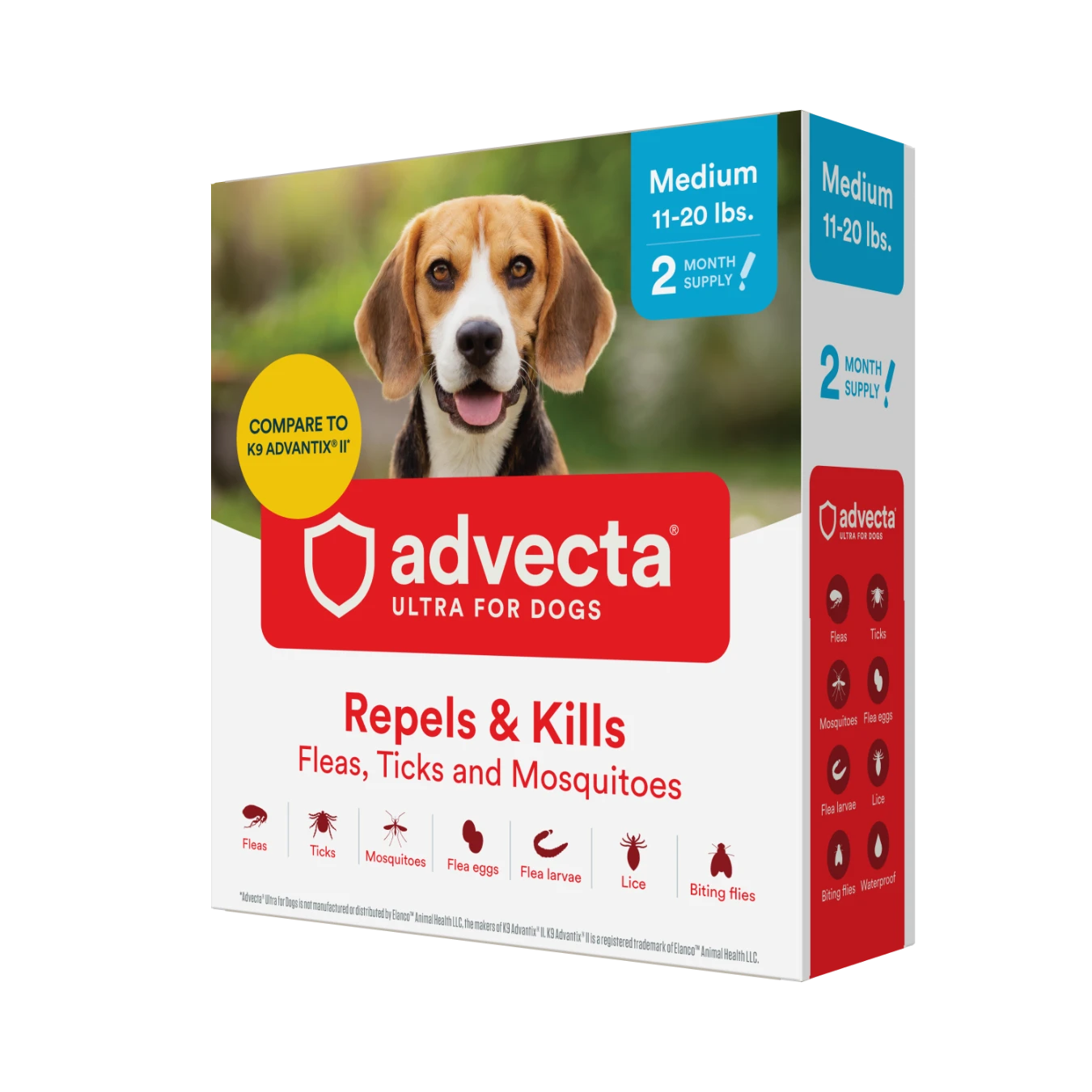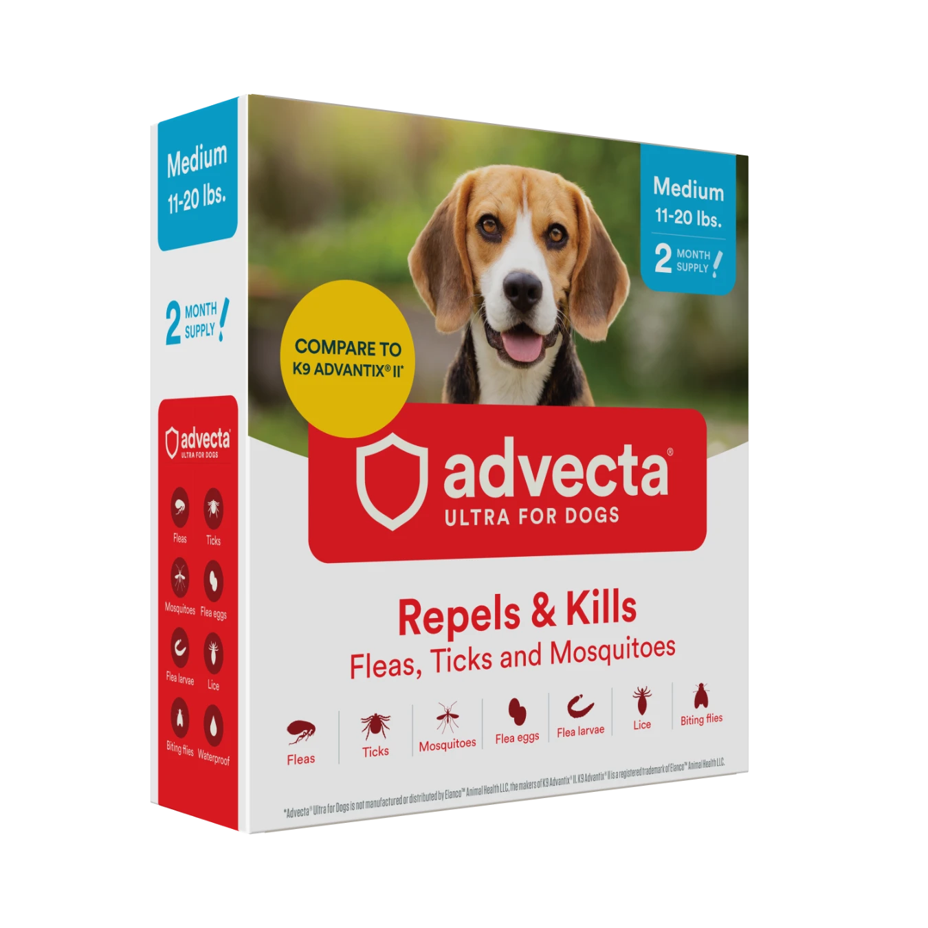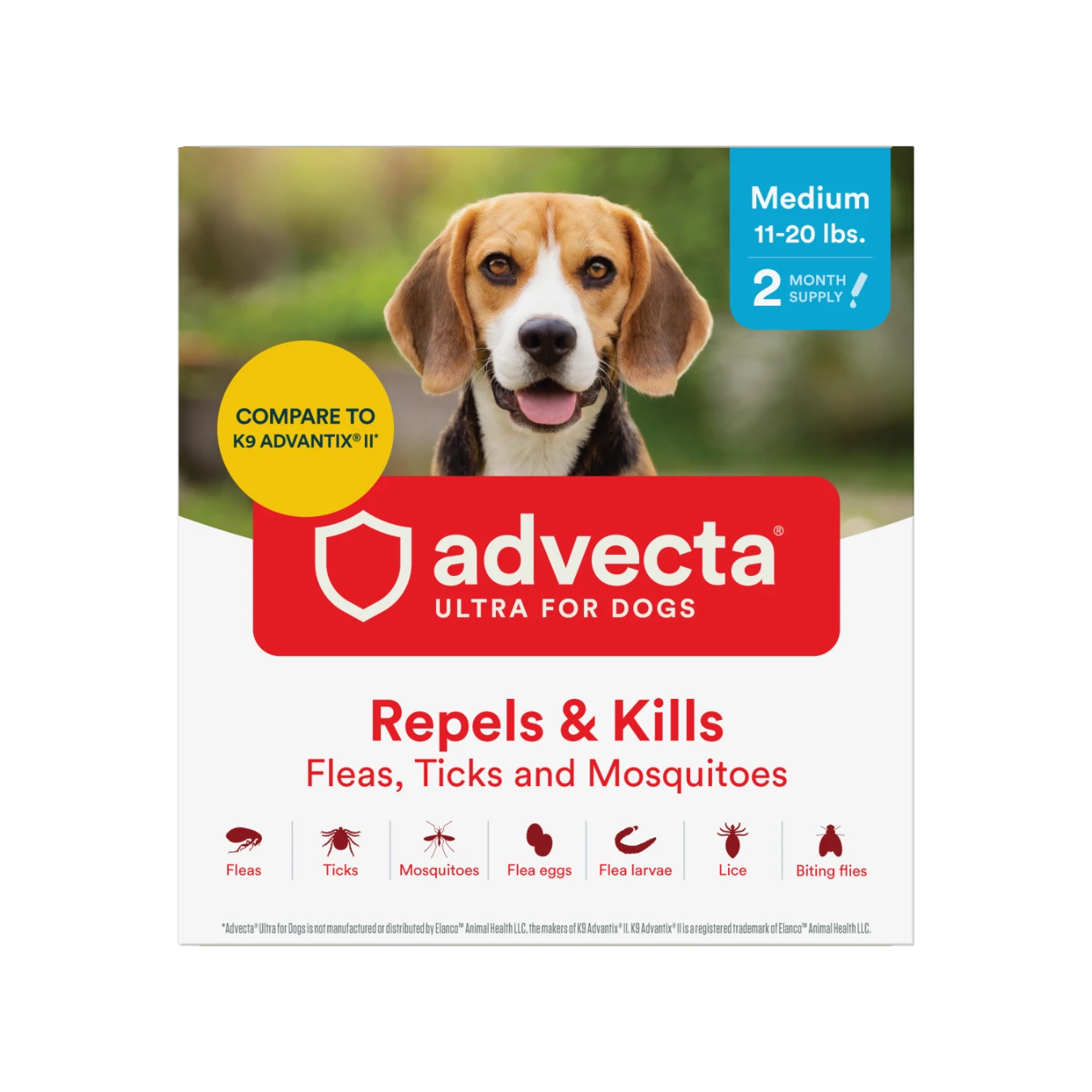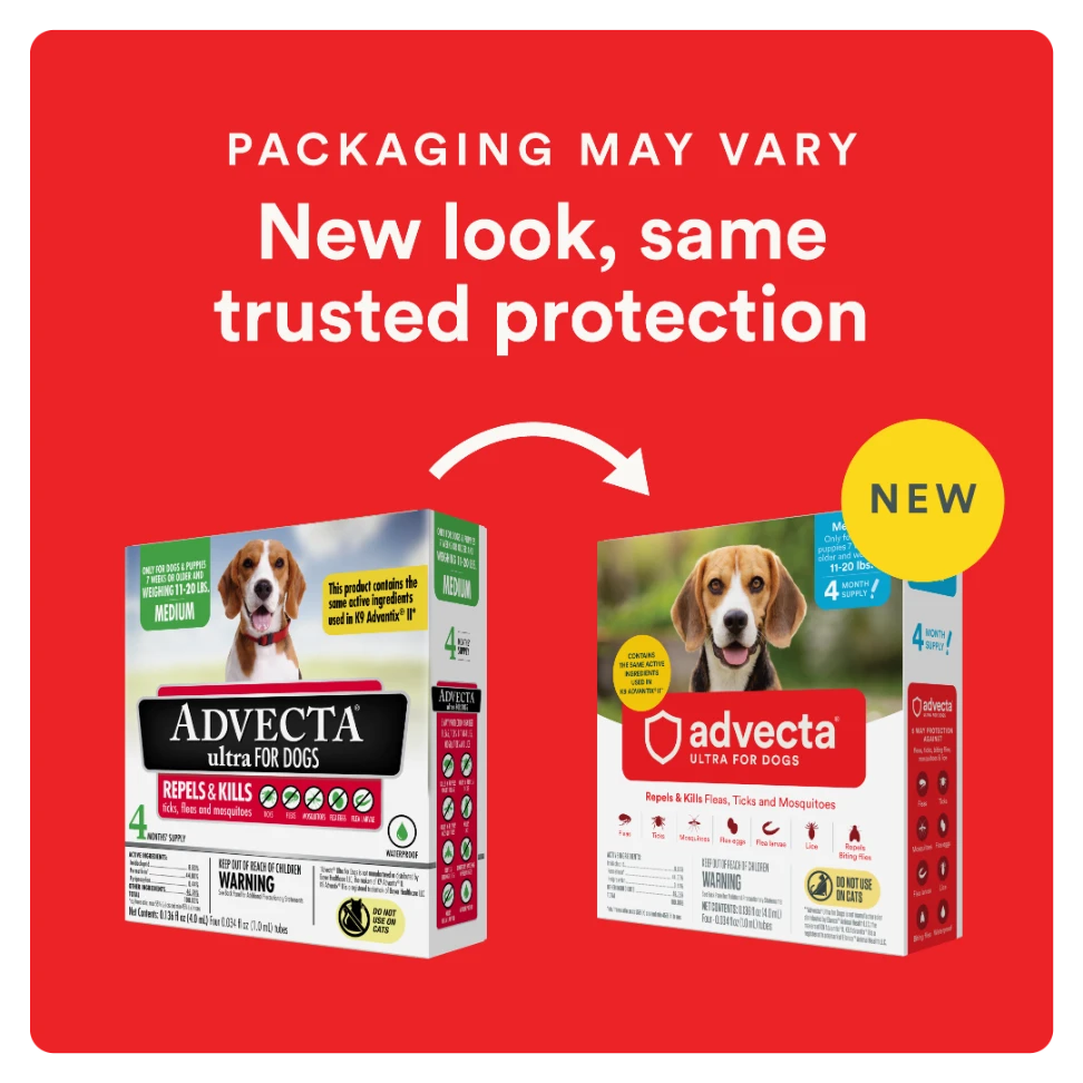 ADVECTA Ultra Flea and Tick Protection for Medium Dogs (11-20 lbs) contains the same active ingredients as K9 Advantix II for Dogs*. This waterproof, fast-acting flea topical for dogs kills and repels fleas, tick, and mosquitoes. Advecta dog tick and flea treatment breaks the flea life cycle by killing flea eggs, flea larvae, and chewing lice for up to 30 days. This topical is great to use during flea season when pet owners spend the most time at the dog park and on hiking adventures. As an alternative to oral flea pills, use this topical alongside a flea comb on coat to keep pets flea-free. *ADVECTA Ultra for Dogs is not manufactured or distributed by Bayer Healthcare LLC, the makers of K9 Advantix II. K9 Advantix II is a registered trademark of Bayer Healthcare LLC.