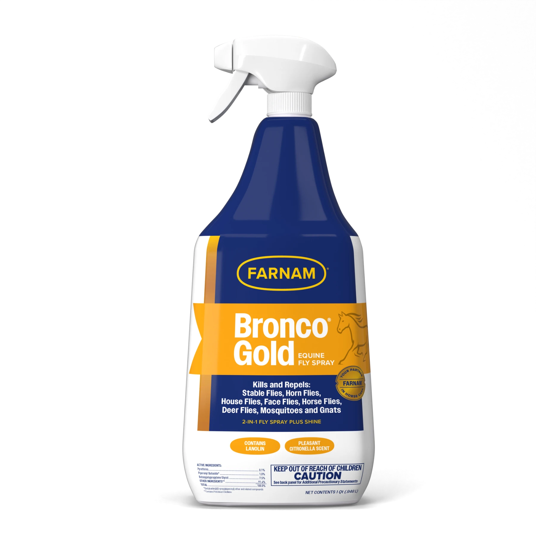 Fly spray has never looked this good! Bronco Gold Equine Fly Spray is a 2-in-1 fly spray that doubles as a coat conditioner and grooming aid for horses. Keep your horse protected while giving them a healthy, shiny coat that looks good to everyone except flies. Horse owners know it takes more than a few different tricks and products to maintain a No Fly Zone. With Bronco Gold Equine Fly Spray, you can provide effective protection and grooming in one convenient bottle. Don’t be fooled by the glossy hair and pleasant citronella scent, this fly spray is a fast-acting insecticide and repellent that kills and repels six types of flies, gnats and mosquitoes. To get the best out of the 2-in-1 solution, simply remove excess dirt and spray or wipe on the product. After applying, brush out your horse’s coat thoroughly to bring out a bright sheen on their hair. You can also apply Bronco Gold Equine Fly Spray as a fine mist spray around your stable area for fast fly treatment. Treat your horse to a bug-free coat with a healthy shine with Bronco Gold Equine Fly Spray.