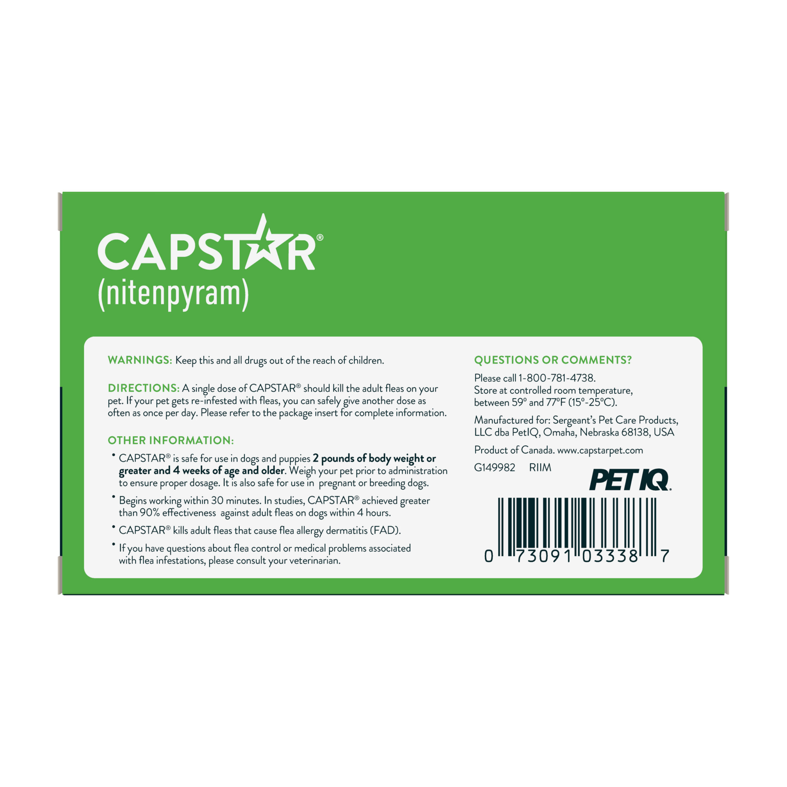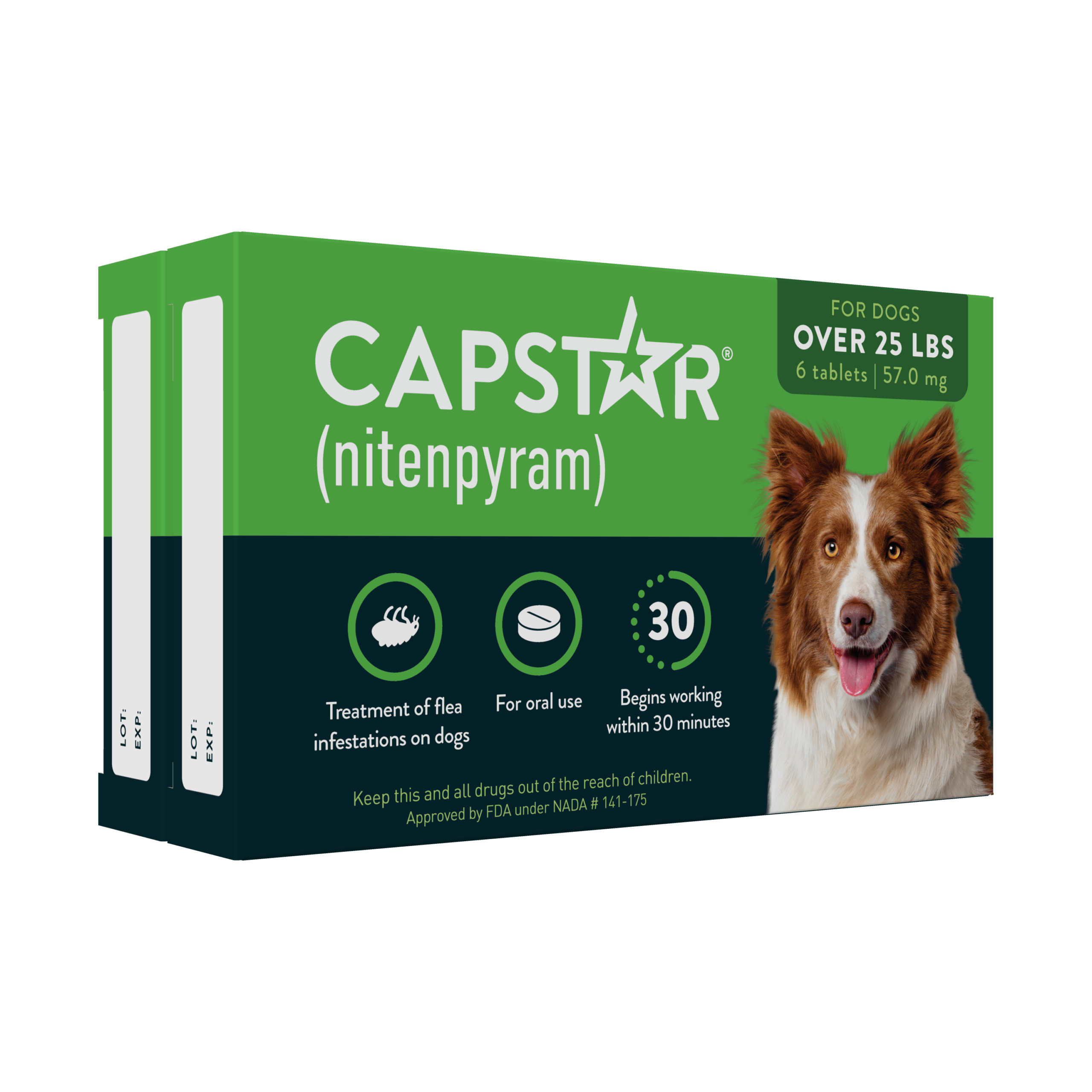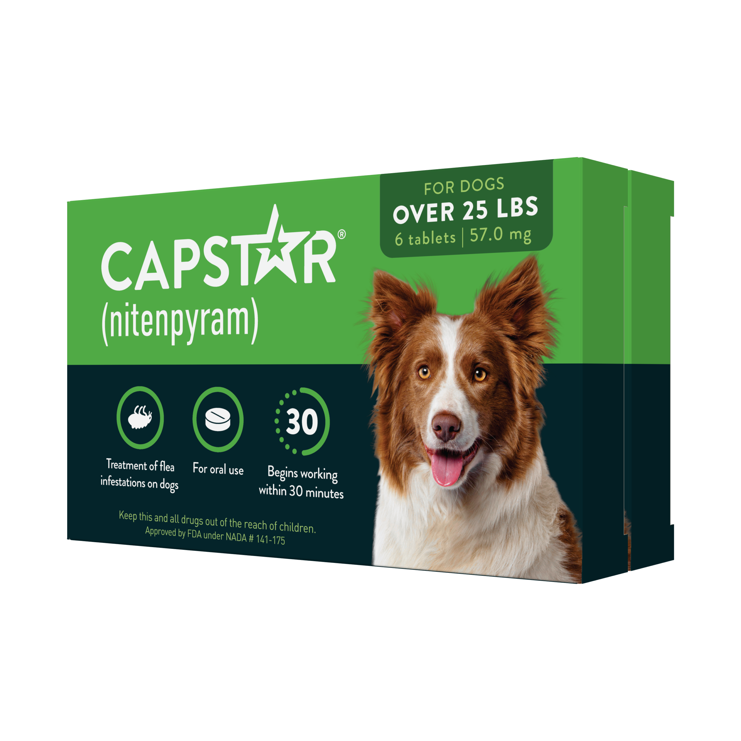 CAPSTAR (nitenpyram) is a fast-acting dog flea treatment tablet for use with dogs that starts killing fleas in only 30 minutes. A single dose of CAPSTAR Oral Flea Treatment kills 90% of adult fleas within 4 hours for dogs. Give this oral flea treatment and watch the dead fleas fall off your pet. CAPSTAR flea tablets are available for dogs and puppies 25.1-125 pounds, and 4 weeks of age or older.